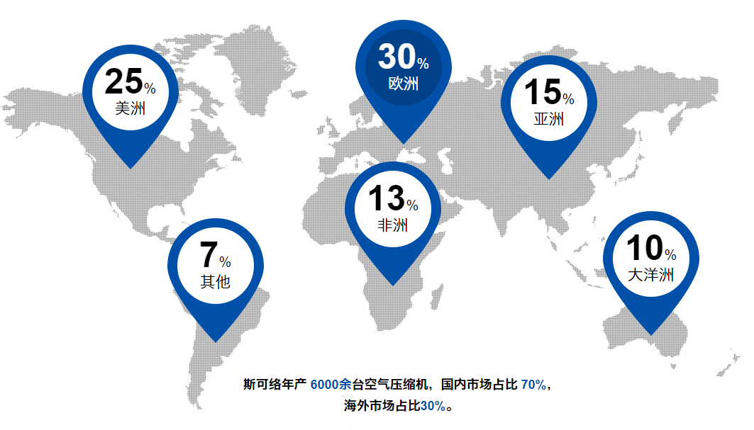 斯可絡(luò)全球化的經(jīng)營(yíng)戰(zhàn)略,鑄就空壓機(jī)行業(yè)品牌地位。斯可絡(luò)商標(biāo)已在世界50多個(gè)國(guó)家注冊(cè),遠(yuǎn)銷歐洲、美洲、大洋洲、東南亞中東及非洲等,依托海外合資公司和歐美辦事處,遍及全球的銷售及服務(wù)網(wǎng)絡(luò)為客戶提供高能效的空氣壓縮機(jī)產(chǎn)品+節(jié)能環(huán)?諝庀到y(tǒng)解決方案+快捷的技術(shù)服務(wù)與支持。
